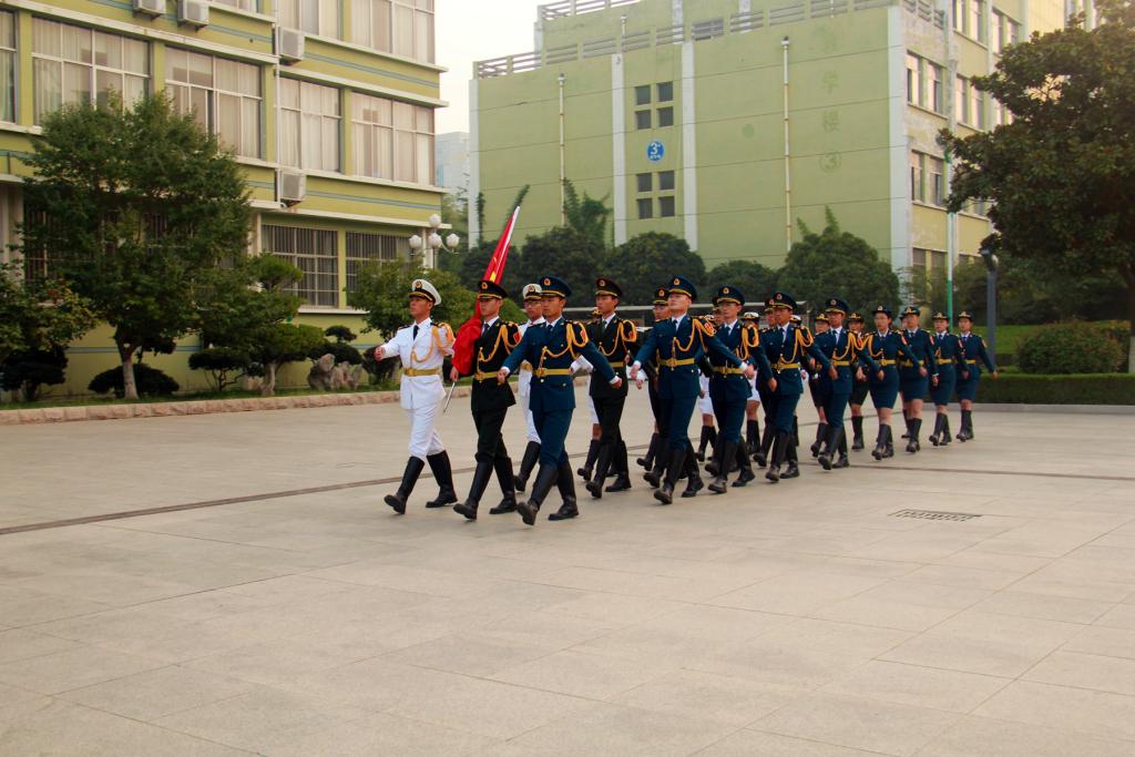 青岛理工大学国旗护卫队迈着铿锵有力的步伐护送国旗入场