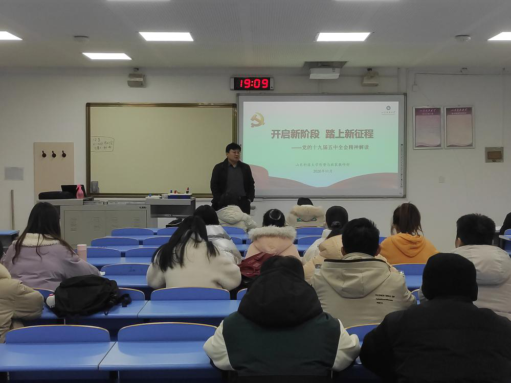 宣讲会上,刘振山就十九届五中全会的基本情况和主要精神做出了全面讲解,并重点解读了“十四五”时期经济社会高质量发展和构建国内大循环为主体、国内国际双循环新发展格局问题。刘老师鼓励同学们要深入学习党的十九届五中全会精神,并以此指导自己的专业学习和社会实践,将小我融入大我,明确人生目标,拼搏奋斗,砥砺前行。