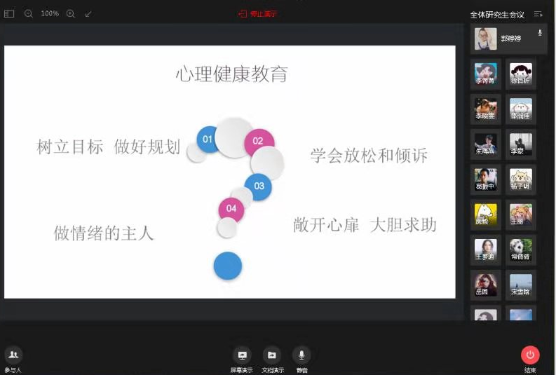 郭婷婷结合学校开学工作方案为员工讲解了信息摸排、返校流程、应急处置方案、返校后相关管理要求。为了帮助员工返校后尽快适应校园生活、学习,她重点讲解了研究生心理健康关爱,介绍了疫情下研究生的心理健康状况及新特点,分享了调整心理状态及减压方法。最后,她希望全体研究生保持积极向上的思想状态,珍惜疫情防控取得的成果,以饱满的精神状态投入到新学期。