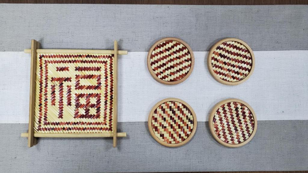 由于泊里红席使用场景越来越少,市场也在不断缩小,yl23411永利“一席泊里红”暑期社会实践队尝试在文创市场寻求一些突破。实践队员设计制作了一款泊里红席伴手礼——“一席泊里红”茶垫组合。这款伴手礼将泊里红席经典的编织技艺与我国传统的茶文化相融合,兼具观赏性和实用性,给泊里红席提供了一个新的使用场景,让泊里红席能够融入到我们的现代生活。