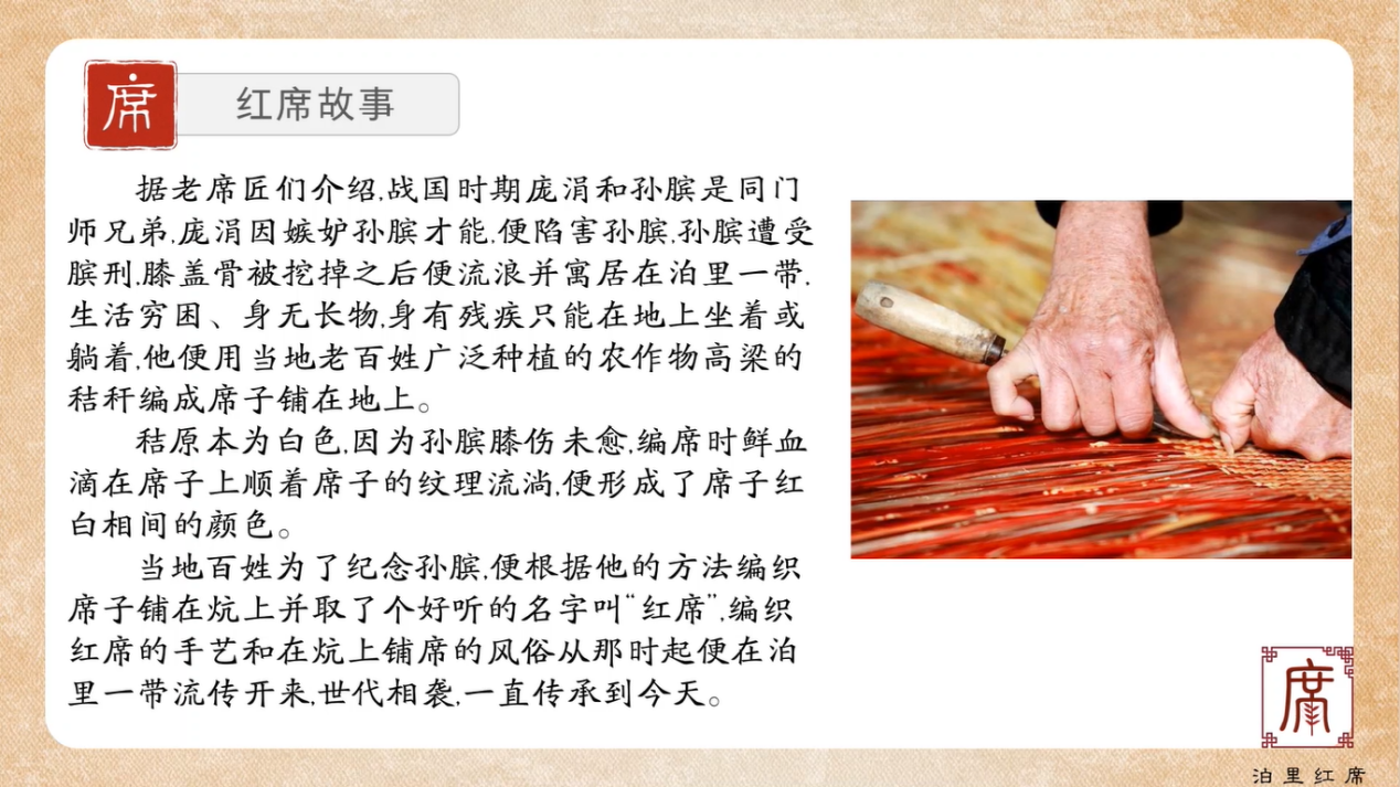 泊里红席是由当地手艺人将红、白两种秫秸破成篾子,再经纯手工编织而成的。其外形美观大方,冬暖夏凉,无毒无味,深受胶东地区人民喜爱。泊里红席编织技艺于 2009年 9 月被山东省人民政府列为“省级非物质文化遗产”。为传承和保护泊里红席非遗文化,yl23411永利“一席泊里红”暑期社会实践队积极行动,拓宽泊里红席销售渠道,开拓泊里红席新市场,搭建有助于红席文化传播的互联网新桥梁。