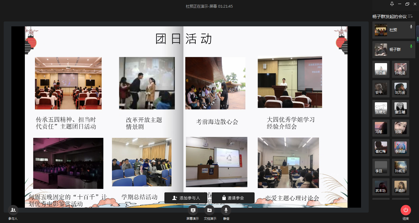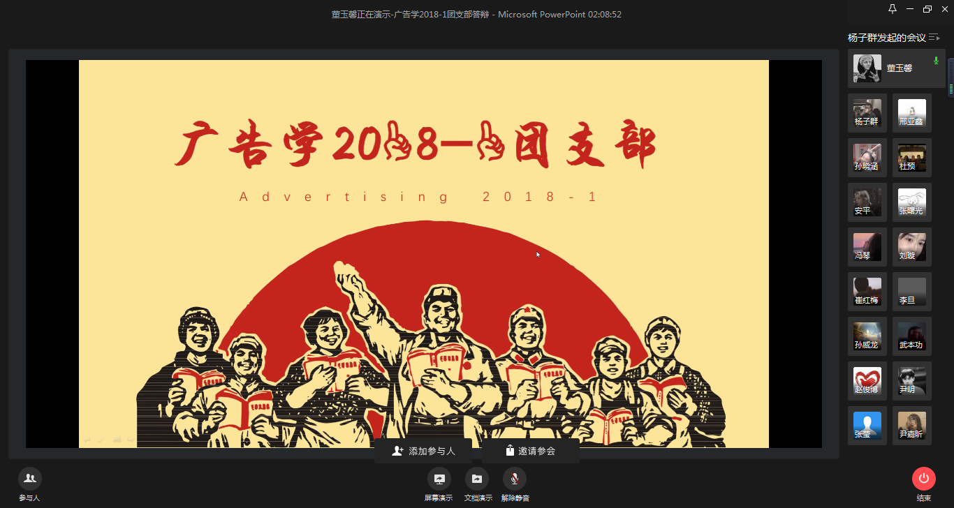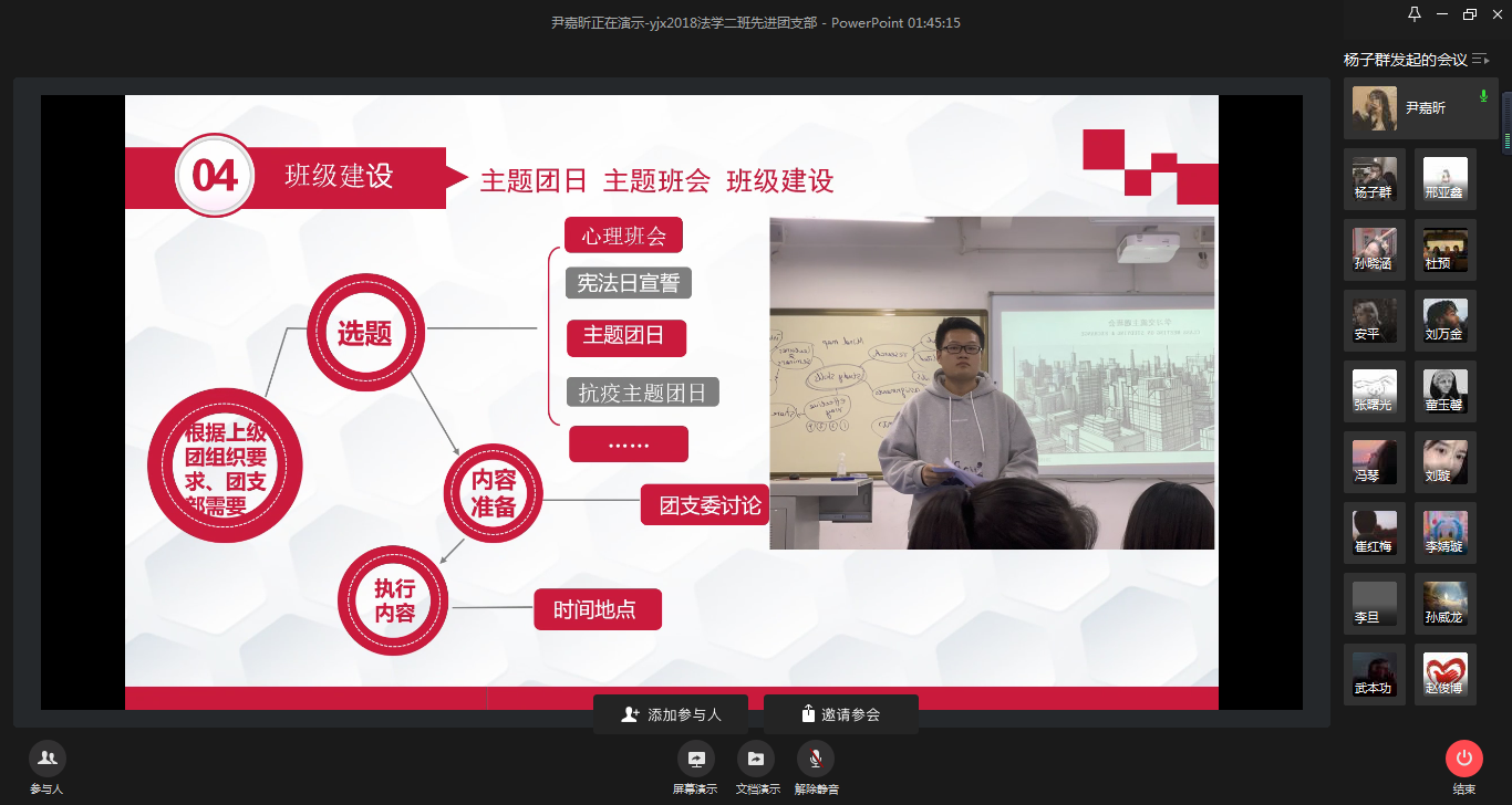 为进一步做好共青团工作,了解各团支部工作进展,充分发挥团支部的战斗堡垒作用,4月6日下午,2018级辅导员老师杨子群、兼职辅导员曲岩组织2018级各班班长、团支书开展先进团支部线上答辩会。