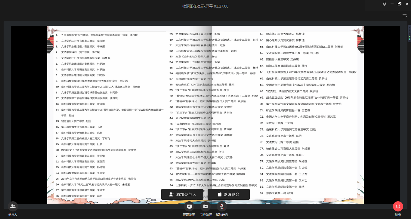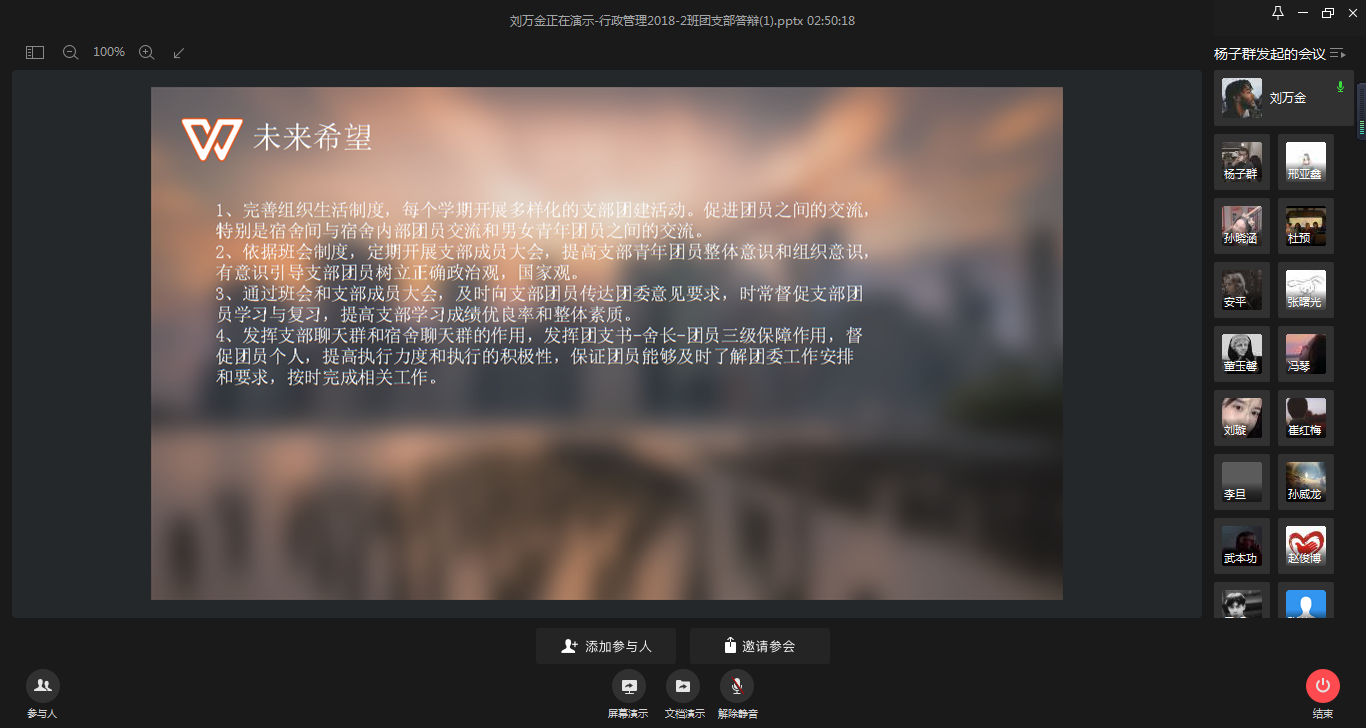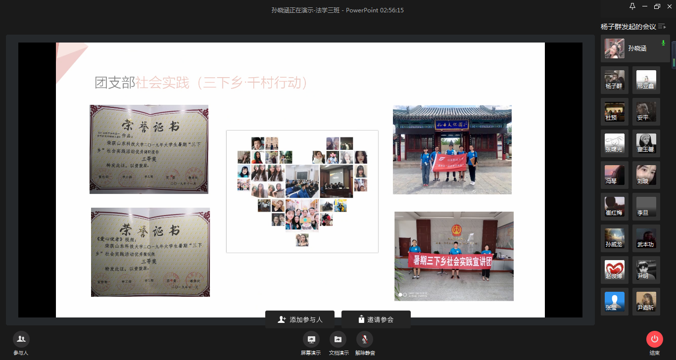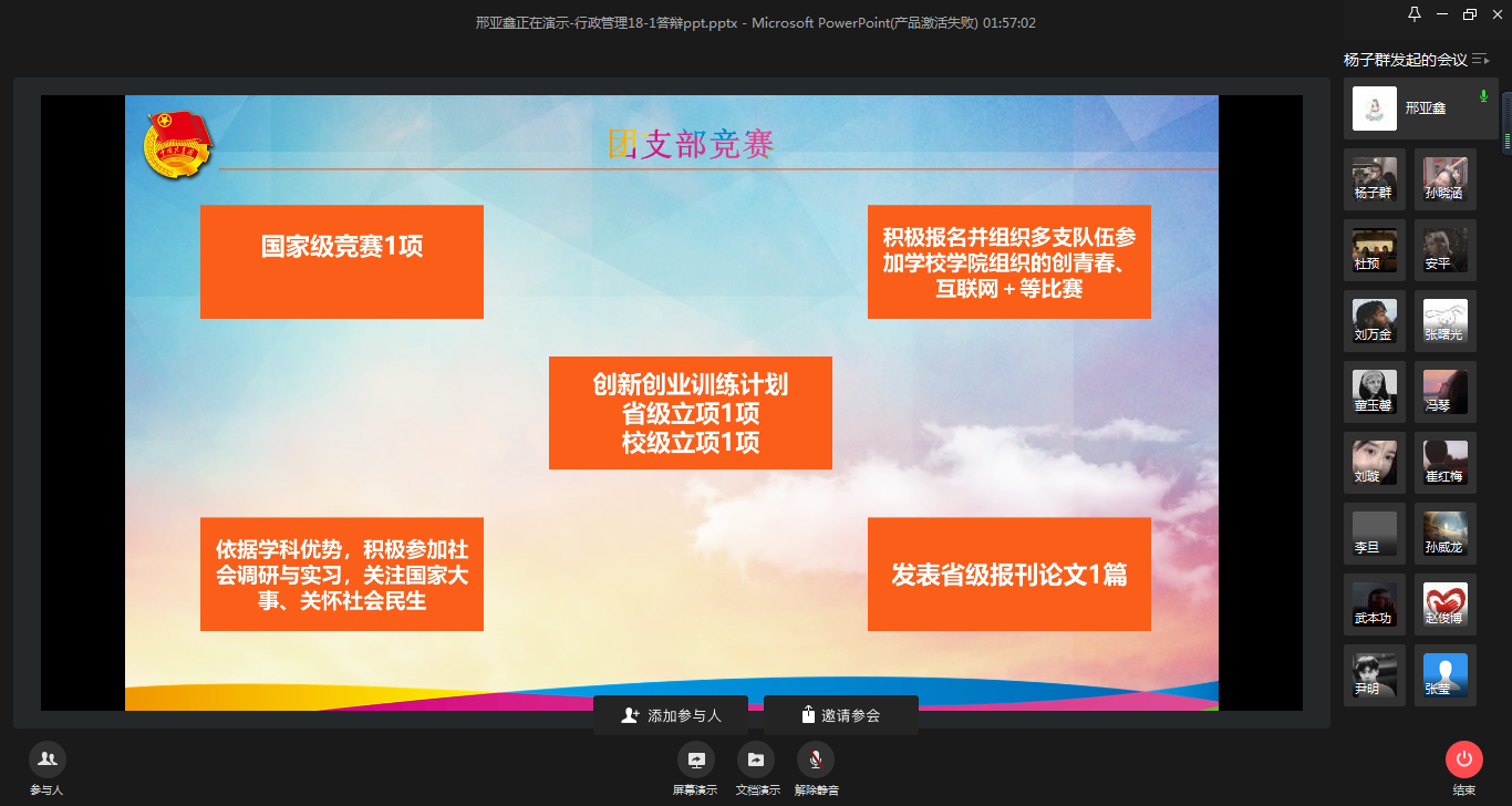 为进一步做好共青团工作,了解各团支部工作进展,充分发挥团支部的战斗堡垒作用,4月6日下午,2018级辅导员老师杨子群、兼职辅导员曲岩组织2018级各班班长、团支书开展先进团支部线上答辩会。