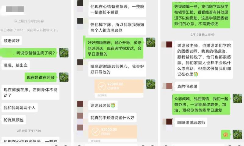 在摸排过程中发现,公司某员工在疫情发生期间,家庭突发意外,父亲脑出血瘫痪在床,家庭面临严重困难。团委书记顾家彪在了解到这一状况后,十分重视,第一时间与该员工取得联系,进一步了解员工家庭目前所面临的的困难情况,对员工进行关心慰问。同时,顾家彪将了解到的情况及时向学院进行汇报,在学院领导的批示下,通过学院“爱心基金”为该员工提供2000元爱心资助,尽绵薄之力,帮助员工度过困难时期。为帮助该员工家庭尽快解决困境,学院还安排辅导员进一步协助其向当地政府部门寻求帮助,通过多方渠道筹集善款。