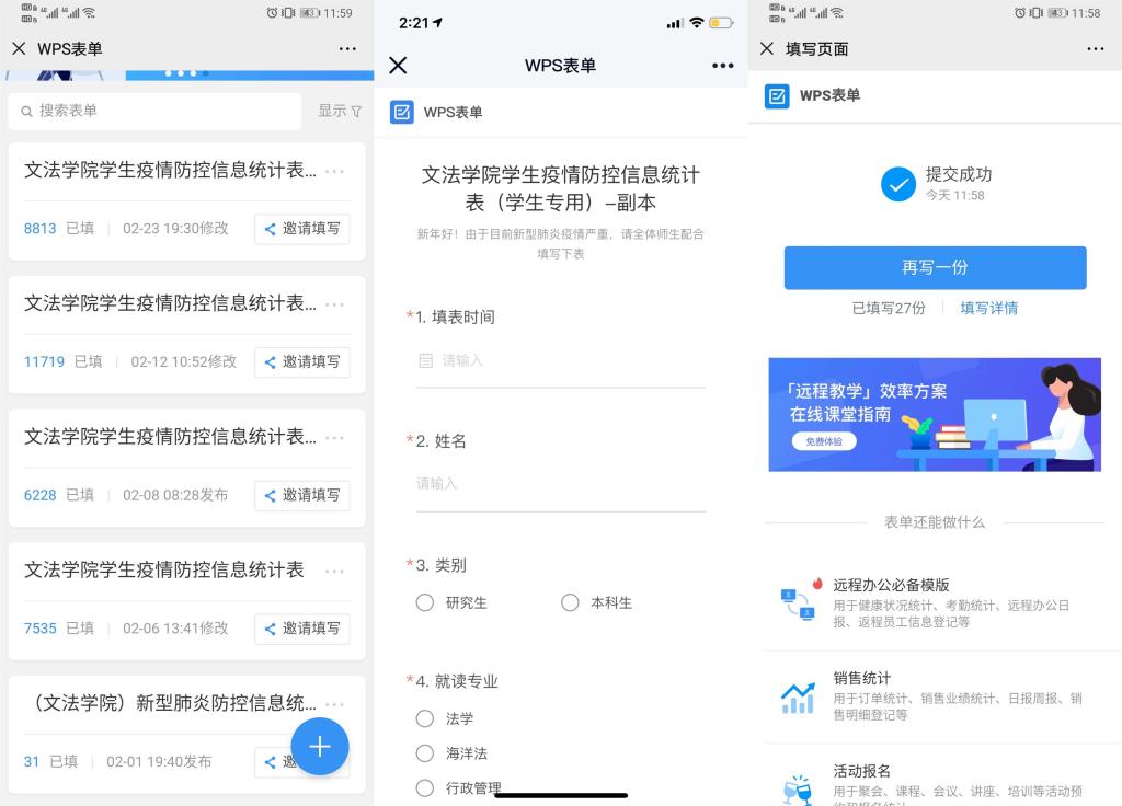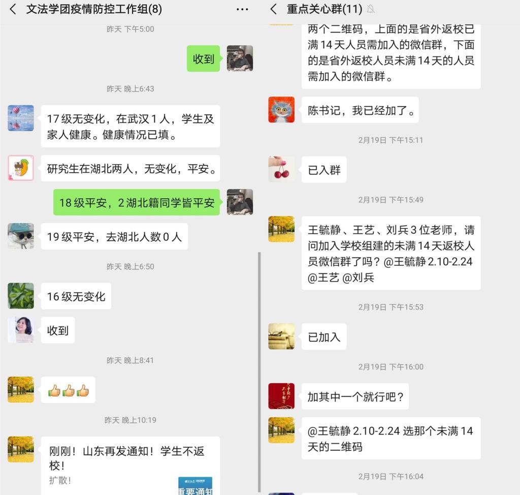 一是做好师生摸排防控,学院利用WPS表单制作详实的师生健康调查问卷,提醒师生每日填写问卷,通过汇总和筛查,及时掌握全院师生的健康状况和日程安排,对出现发烧、咳嗽、咽喉疼痛、乏力等症状的人员,及时跟进联系,确保全院师生的健康安全。二是做好卫生整理和消毒工作。学院为每个办公室配备了消毒用具,统一配制消毒液,要求各位出入办公室值班的老师,每天做好各自办公室卫生整理和消毒工作。同时,公司党政办老师负责对学院公共场所每日消毒一次,切实防止输入性疫情传播。三是做好对重点人群的关注。针对学校提出的“全覆盖、无死角,纵到底、横到边”的防控工作要求,公司党委坚守职责、靠前指挥,排摸所有来自重点地区或途经重点地区或与重点区域亲友接触的师生信息;精确统计湖北籍员工或有湖北旅居史的员工目前健康状况,对排查到的5名同学,实行每日“零报告”制度。对于外地返校教职工,进行严格的登记上报,要求返校后自行居家隔离14天,严格遵守并配合学校疫情防控工作安排。
