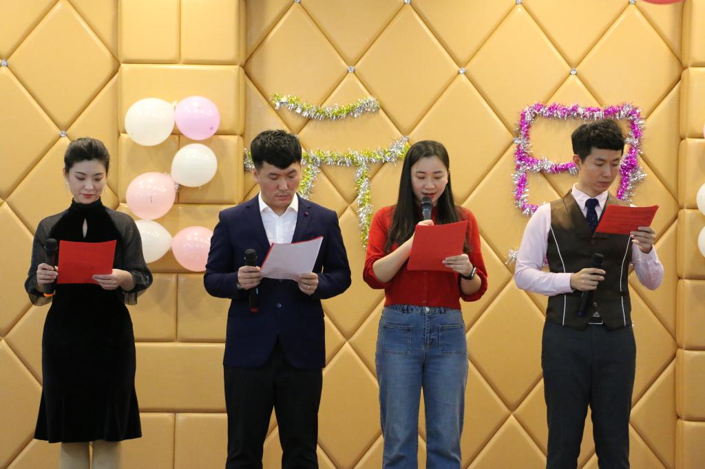 晚会开始前,徐铃平首先对公司一年来的公司产品工作做出简要总结。他充分肯定了学院教职工一年的劳动成果,并代表学院向现场的老师致以感谢和新年的问候。晚上7:00,晚会准时开始。伴随热烈的掌声,管理岗位的老师们为大家带来了开场舞蹈《失恋阵线联盟》,轻快的音乐,“优美”的舞姿,赢来了现场的阵阵掌声与笑语。在接下来的表演中,法学系、管理系、中文系、广告系的老师们各展才艺,分别为大家带来了《野狼disco》《青春万岁》《明天会更好》等精彩的节目演出,更有许多老师即兴献唱,晚会气氛热烈。晚会前,到场教职工共同包饺子,并在观赏节目期间共同享用劳动成果。晚会中间还设置了抽奖和游戏环节,萝卜蹲、我来比划你来猜等游戏为晚会增添许多欢快的色彩。
